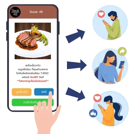 ลูกค้าสมัครใช้งานง่าย ไม่ต้องโหลดแอพเพิ่มเติม เพียงเพิ่มเพื่อน Line Official กับทางร้านเท่านั้น กดที่ริชเมนูเพื่อรับโปรโมชั่นในรูปแบบ Flex หรือผ่านช่องทางบอร์ดแคส